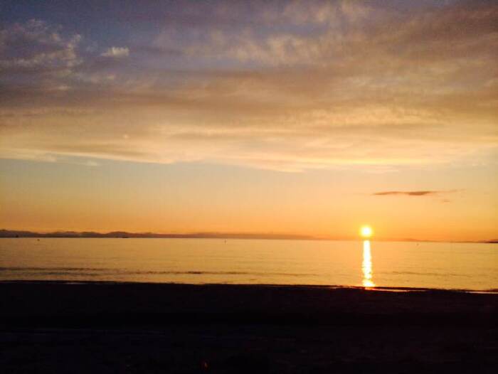 (拍照千万不能对准人群,这是不礼貌,也是侵犯他人隐私的。九点钟的夕阳,海面一片平静)