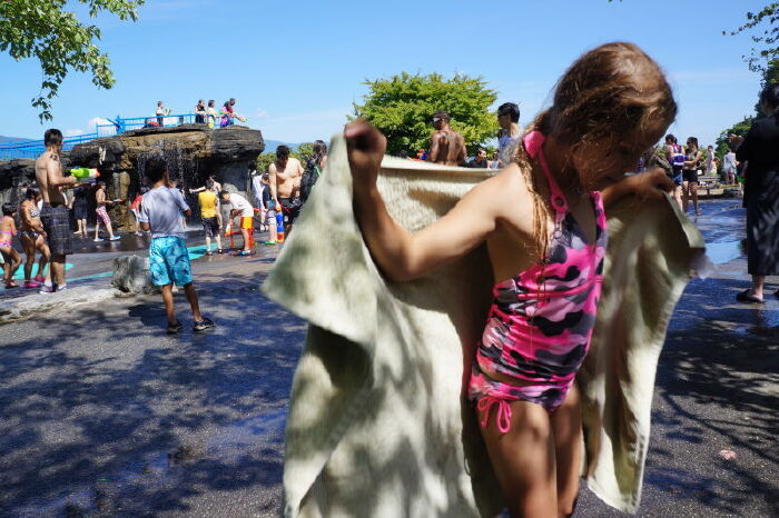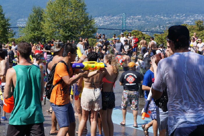(解暑最高招,参加史坦利公园的泼水节吧!本来我们是来采访这个活动,好回去交作业的,但当我喝完杯子里的柠檬水,果断加入混乱的打水仗的行列,工具么,当然就是手中的饮料杯啦~~)