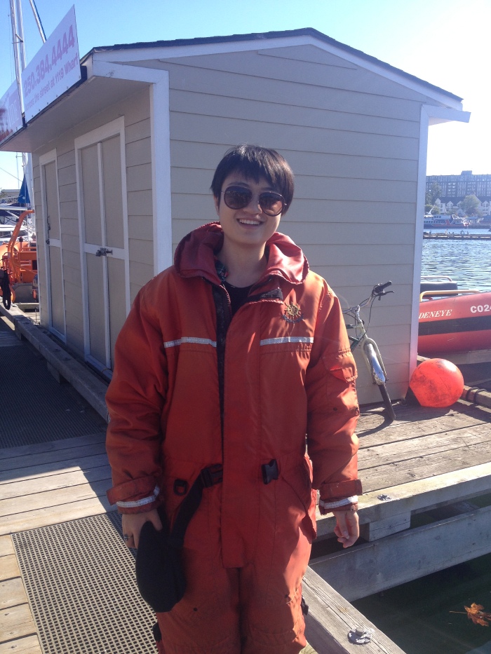(穿上厚厚的防风服,准备登上游艇去观鲸了!这衣服重得,简直像宇航服,但是小艇飞驰,海风大得睁不开眼,海面温度会骤降,所以保暖的防风服其实是生命的保证哦~)