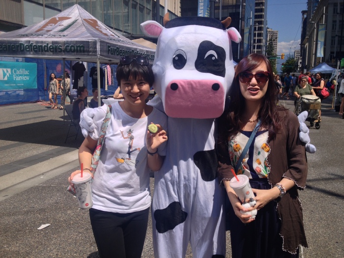 (Vancouver Veg Fest, 一年一度的环保与素食组织的活动,奶牛人偶来自保护奶牛组织,该组织呼吁尊重作为母亲的奶牛,以豆奶代替牛奶。乳业公司在饲养奶牛的时候,注射的抗生素会 通过奶牛进入乳汁,但目前我的生活水平还是屌丝级别,还是急需牛奶补充营养TT,抱歉了,奶牛们~~~)