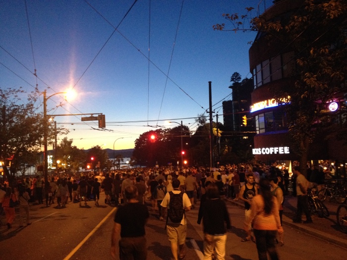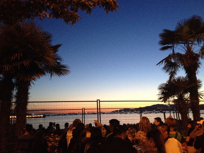 恰好遇到温哥华烟花比 赛,来自美国、日本、法国的三支顶尖烟花团队齐聚温哥华,让七月夏日晴朗的夜空变得非同寻常,每周会有一个国家进行二十分钟的展示,英吉利湾是观赏的最佳 地点。欣赏烟花的同时打开手机里面的收音机功能,能同步欣赏到背景音乐,烟花随着音乐的节奏跳动,到最后烟花像喷泉一样渐渐熄灭,却惊喜地留下一个小高 潮,这才正式鞠躬闭幕。展示结束的时候,人真的很多,警察一度过来交通管制,但是怎么说,跟外滩相比人还是很少,人们有秩序地分流,半个小时之后人群就都 疏散了,依稀可见坐在路边等同伴的年轻人,打扮妖娆准备泡吧的姑娘们。