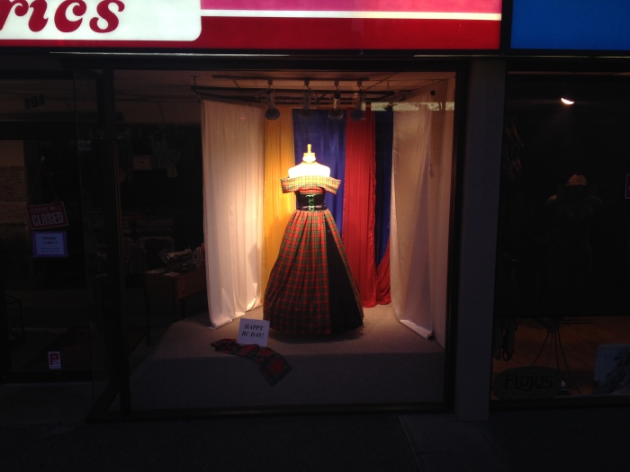 (傍晚,淡淡地灯光下,一条格子长裙。有时候,不是我们在观赏她,而是她在观赏我们。BC Day,全省放假两天。)