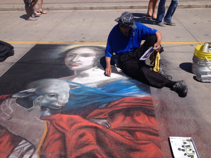 (来自中国的街头画家,我想他身后一定有着丰富的故事。我们付费欣赏了几分钟他的作品,也揣测了几分钟他的经历,他模仿的名画是抱着白色羔羊的妇女,羔羊意味着贞洁与牺牲。)