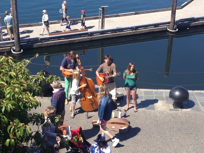 (有一家人在码头边弹奏演唱,小儿子金发飘飘,帅气地拉着大提琴,瞧这一家人,让人好生羡慕!)