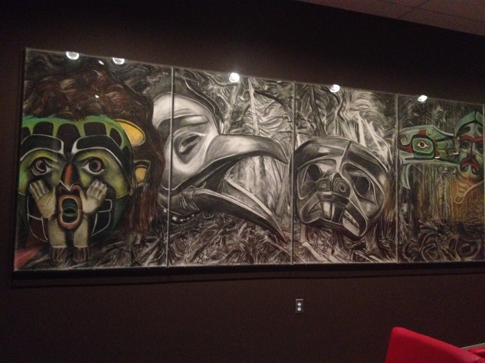 有一篇论文是带着温哥华记忆,写的是Trickster,有感于UBC人类学博物馆(MOA)里的图腾柱还有原住民神话里诡计多端神。想到原住民,你会想到什么?许多人都会想到彼得潘里面头顶羽毛,转圈跳舞的印第安人,或者是好莱坞电影里骑马追赶火车,披发文身的战士。其实站在市中心,在你眼睛所能看到的地方,学校、公司、商店、乐团、电视台、医院,原住民就跟你我一样,在城市里生活着,也同样挣扎着。这是殖民者后代的加拿大,也是移民的加拿大,更是原住民的加拿大,只不过在这一股股浪潮中,原住民更难以留住他们文化的根。在MOA展出许多原住民青少年的艺术作品,他们希望在乱绳交错的线球中,找出那个带着族群记忆的线头,走出身份失落的米克诺斯迷宫。